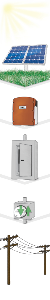 When the sunlight hits the solar array, the high-efficiency crystalline-silicon PV modules produce DC current, which flows to the inverter.