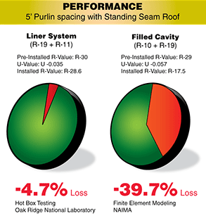 When using a "Liner System", a continuous flexible membrane (vapor retarder) is installed below and uninterrupted by the purlins and is held in place by the support bands. There is typically a dead space between the liner fabric and the bottom of the purlins. The liner fabric material creates a relatively uniform depth space which is needed for the first layer of unfaced insulation to rest upon. Blow in insulation can also be utilized in place of insulation blankets. With proper vapor retarder placement and isolating the highly conductive purlins, it reduces potential condensation problems and extends the life of the roof. It also provides a more finished ceiling appearance which offers excellent light reflectivity and excellent sound absorption. In contrast, when using a typical "Filled Cavity/Long Tab" assembly, the highly conductive purlins are left exposed to the interior of the conditioned space and there are typically uninsulated gaps along the purlins. Heat escapes in the winter through the exposed purlins, while in the summer, the exposed purlins conduct and radiate the roof absorbed heat into the building's interior. The purlins may be seasonally below the dew point which will lead to condensation, corrosion and a shortened roof life. The exposed purlins also are more prone to absorb light, collect dirt and cast shadows requiring unnecessary interior lighting. When comparing the performance of the two insulation assemblies, you will see the performance difference is substantial. Take a look at the example comparing both assemblies utilizing a standing seam roof with a thermal block installed between the purlin and the roof panel with purlins spaced five feet on center.
